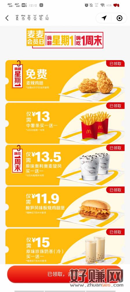 领取路径:小程序:麦当劳 点击“会员日”,直接领取到卡包,仅限在4月17日当天到店任意消费随单使用