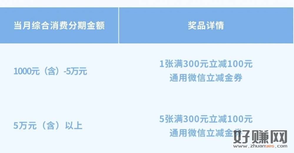 2.综合消费分期:持卡人当月综合消费分期业务金额满1000元达标,次月有机会领取通用微信立减金。