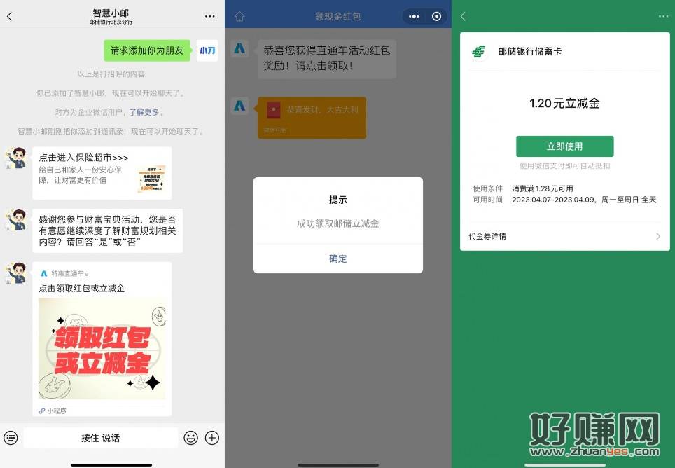 目前还有【特惠直通车领1.2元邮储立减金】微信打开地址->添加后点击推文进入->直接领1.2元微信立减金,在卡包中查看