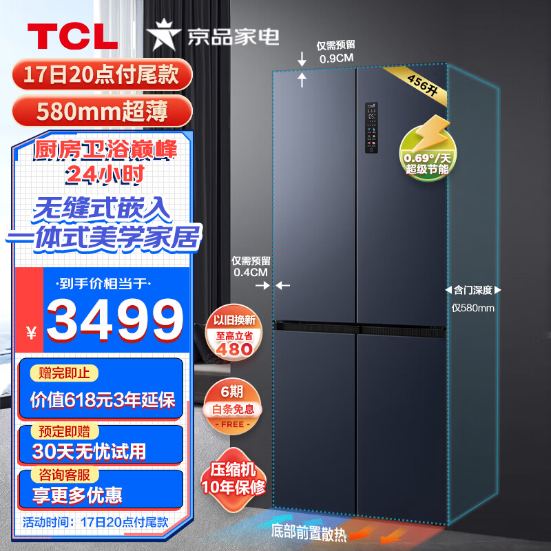 P家居特权卡领499-40京贴券,TCL 456L十字四开门冰箱580mm超薄嵌入式 R456T9-UQ