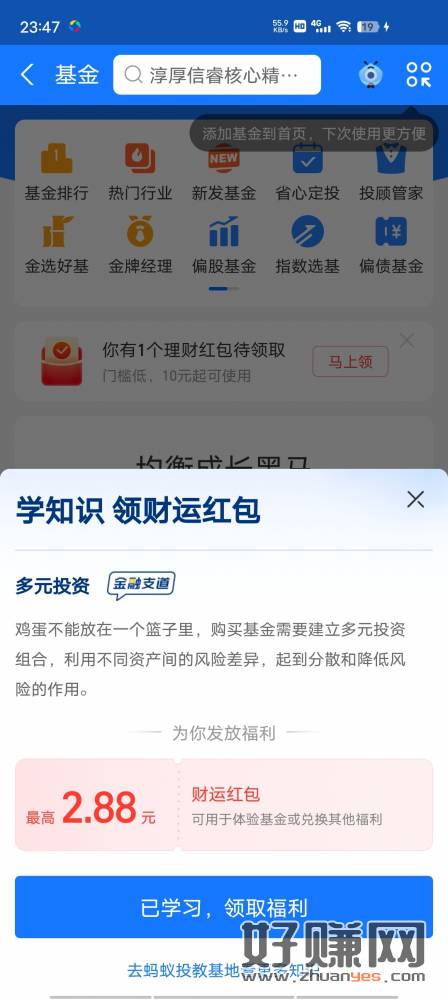 理财-基金 活动栏或者下方 有个学知识领理财专项礼 买007916一百块