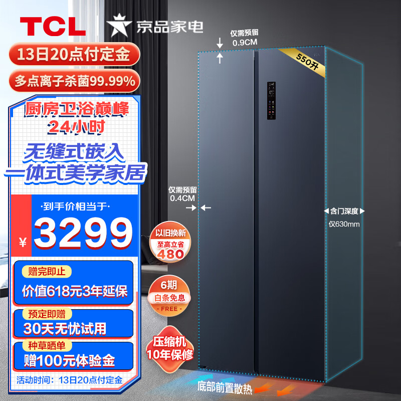 P家居特权卡领499-40京贴券,TCL 550L双开对开门冰箱 超薄嵌入式 R550T9-SQ