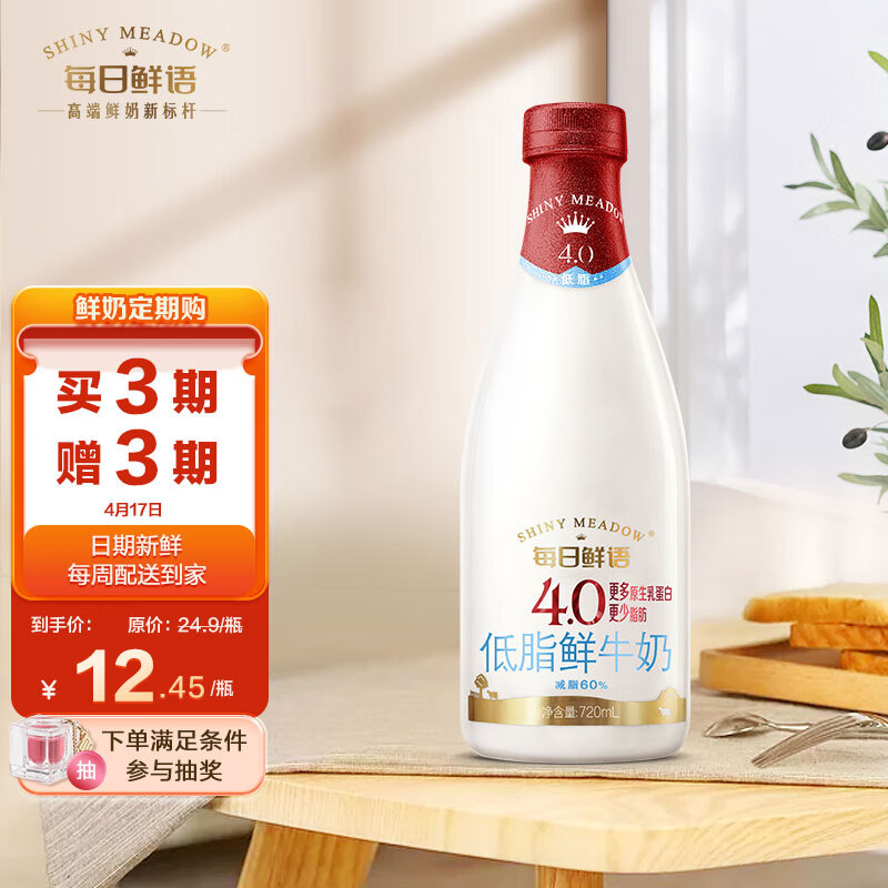 鲜牛奶每周一送,每日鲜语 4.0低脂鲜牛奶720ml*1瓶