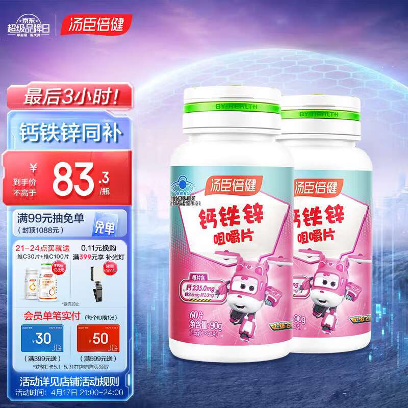 汤臣倍健 儿童钙铁锌咀嚼片60片2瓶装,赠维生素C甜橙味100片,PLUS季卡一张