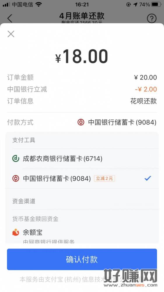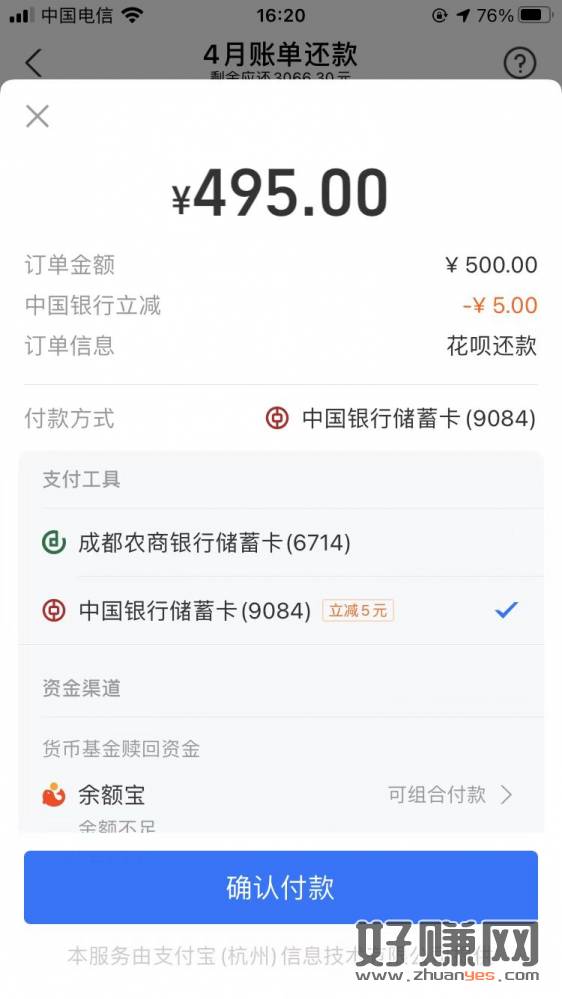 支付宝中行还花呗500-5和20-2,每人7不限卡