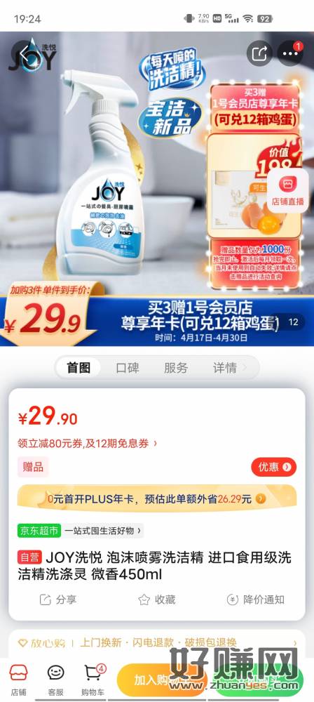 JOY洗悦 泡沫喷雾洗洁精 进口食用级洗洁精洗涤灵 微香450ml