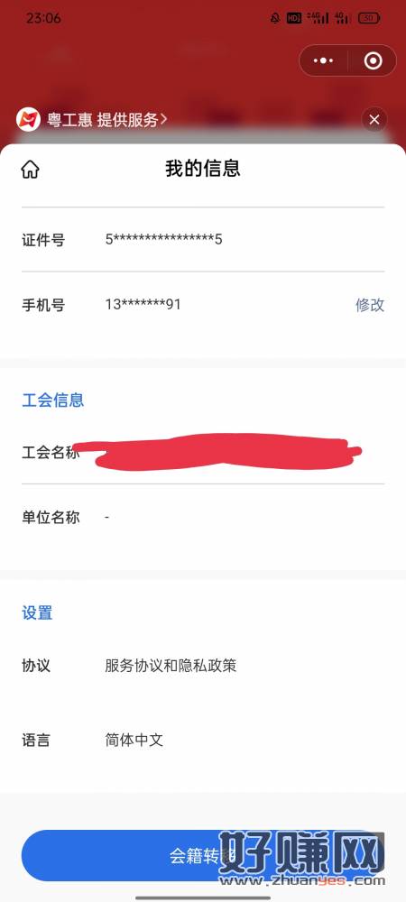 微信搜索粤工惠会员活动小程序,右下角会员,个人中心,会籍转移