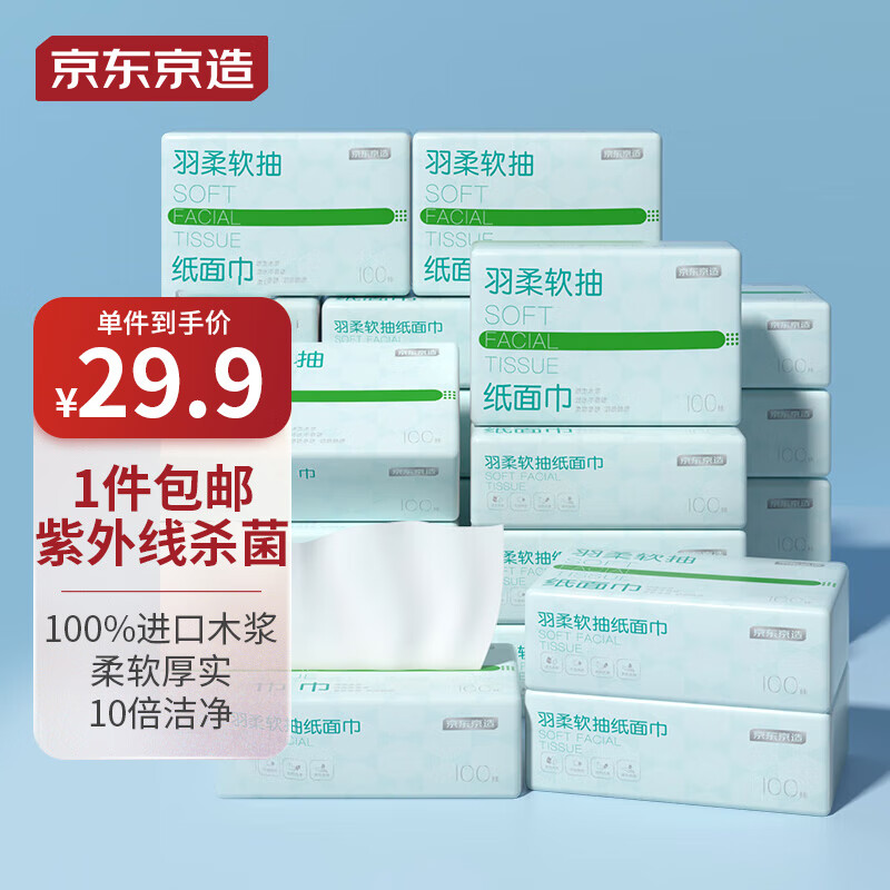 京东京造抽纸 羽柔纸巾100抽*20包 3层无香纸巾