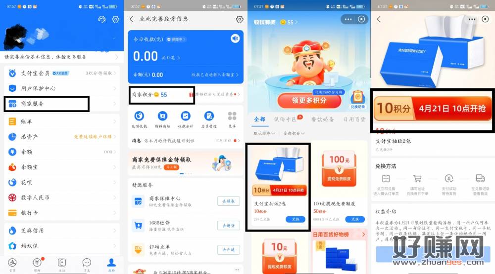 支付宝—我的—商家服务—商家积分—支付宝10积分抽纸两包(没有积分的点上面的领更多积分,随便做个任务就可以了)