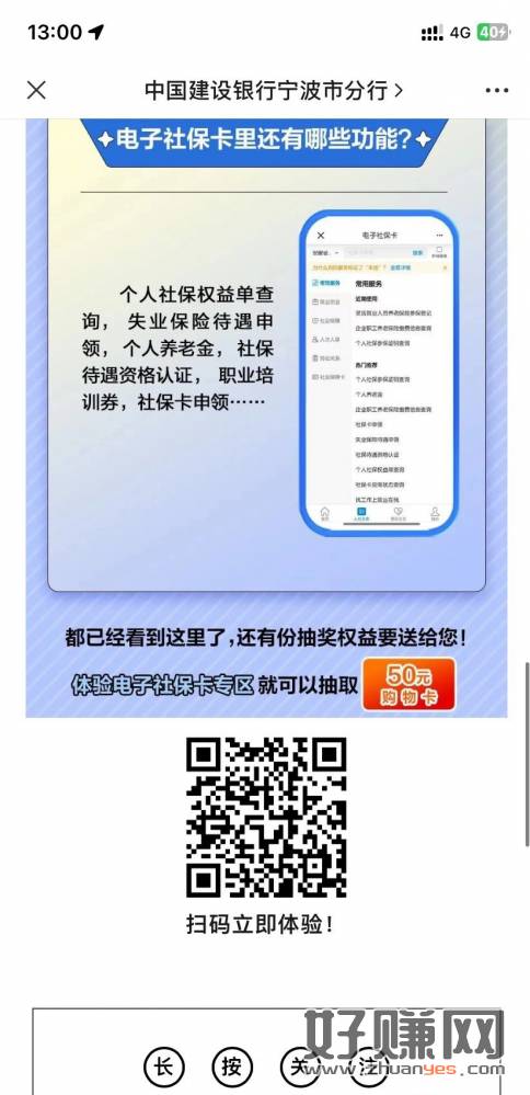 微信扫码跳转建设银行,查看社保卡抽最高50