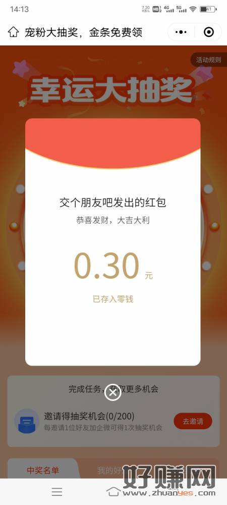 进去添加企业微信,抽奖,必3毛,拉一个人3毛,懒得发邀请贴最