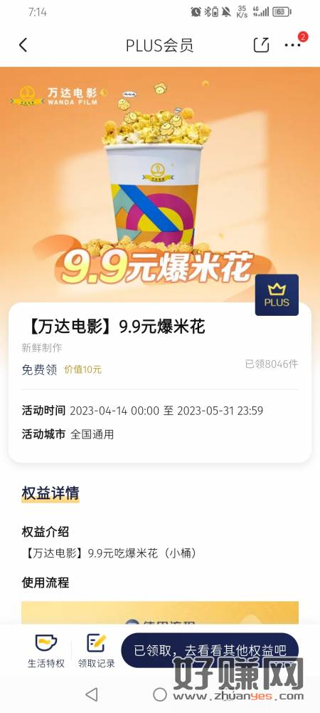京东plus特权 万达爆米花 领完出