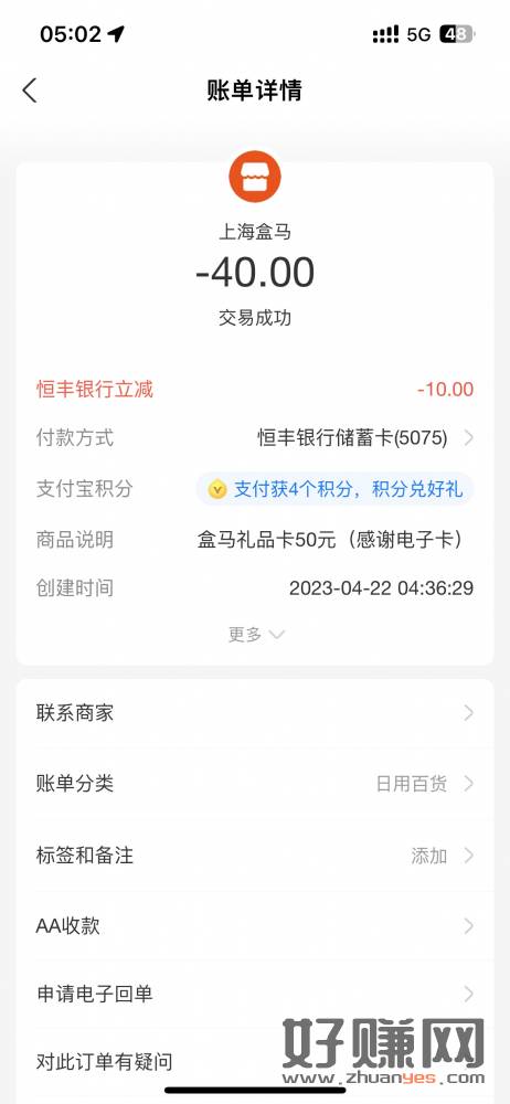 恒丰银行在盒马app买盒马50礼品卡立减10,这个月我是第二