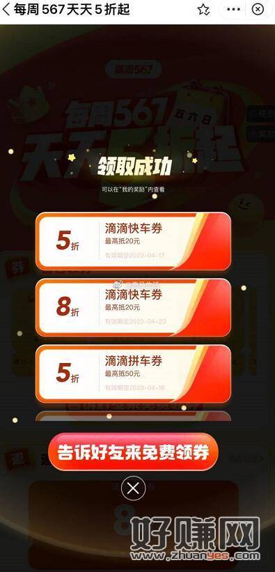 【滴滴出行领取周末5折打车券】每天打开链接都可以领取5+8折快车券