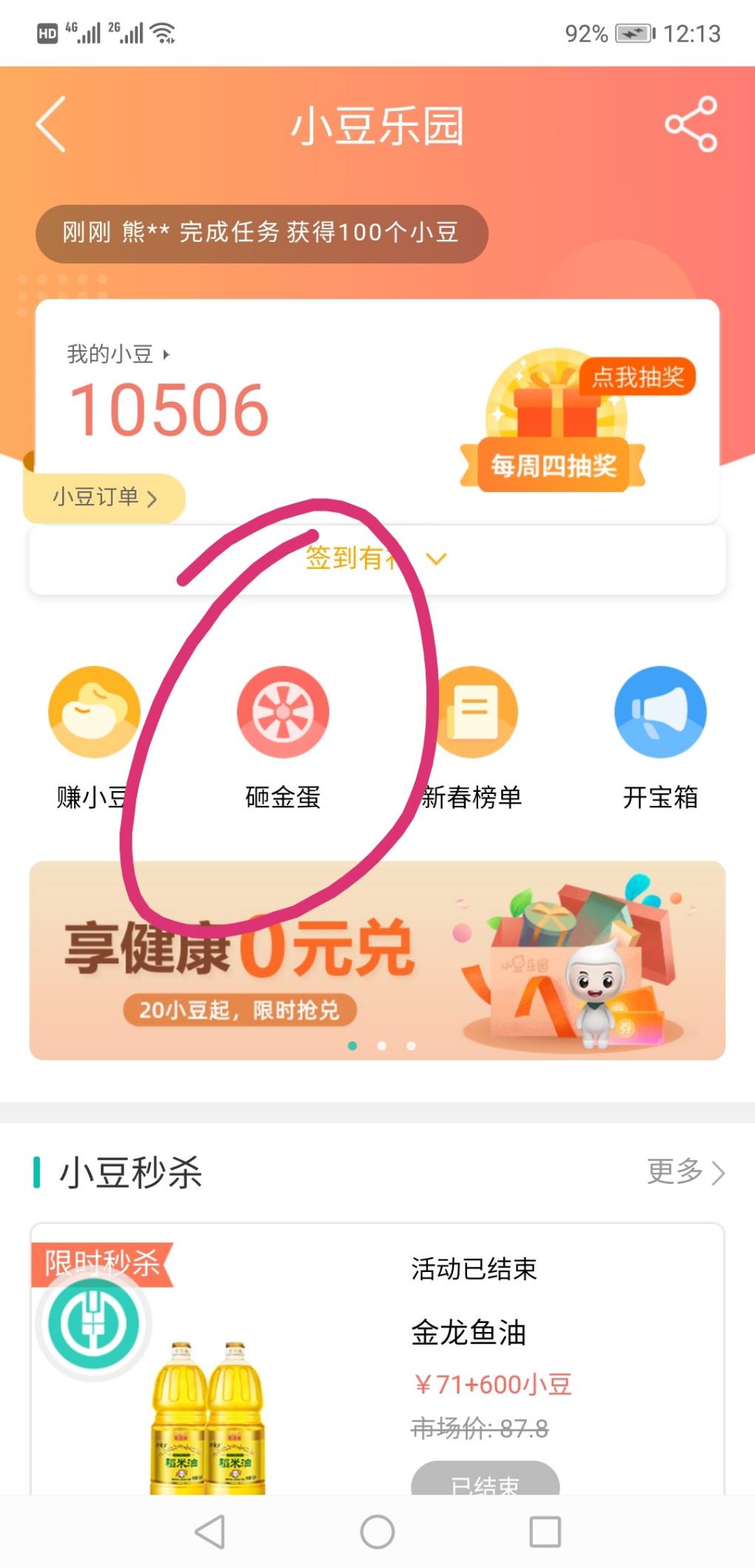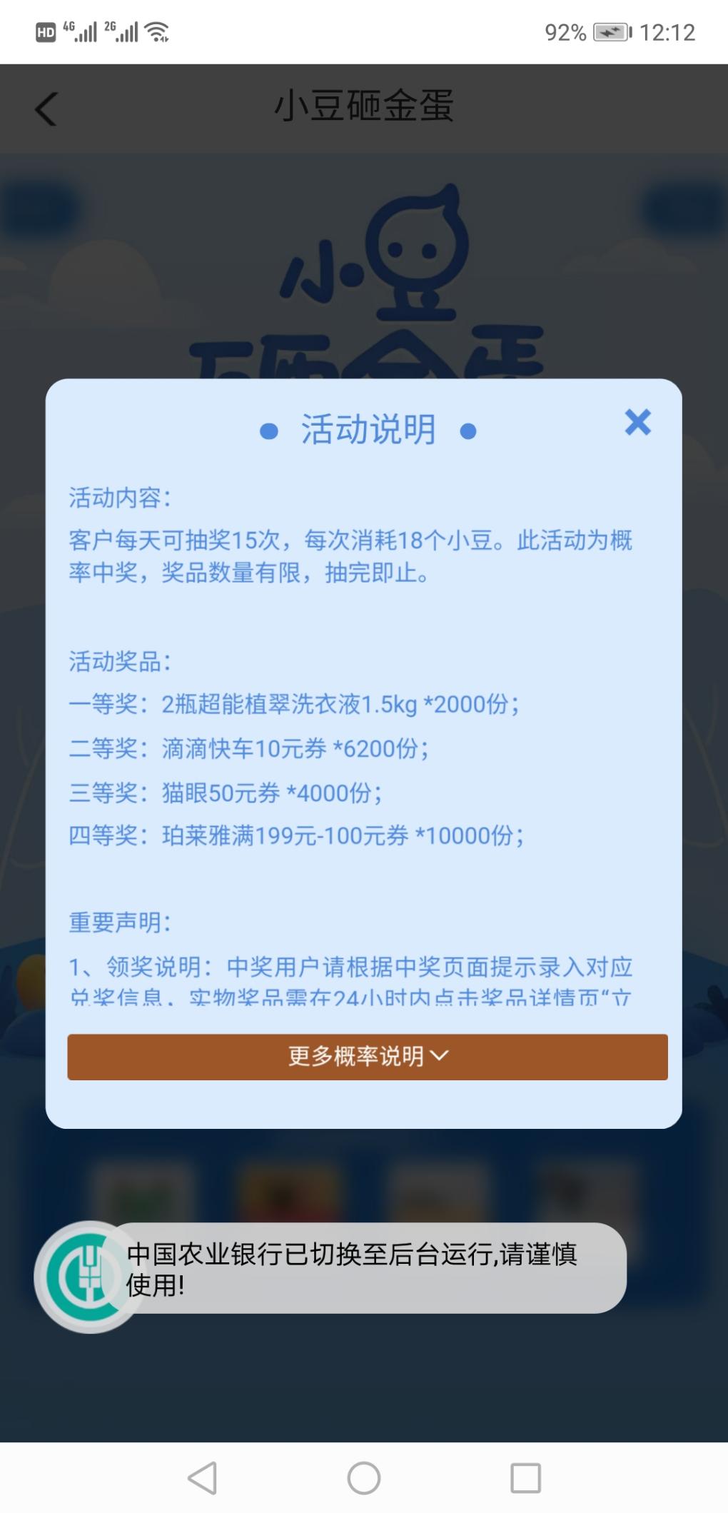 路径:农业银行app 我的 签到 小豆乐园 砸金蛋 18豆豆一次 可砸15次 最新的活动 今天刚开始 中了个50猫眼兑换券 豆豆随便签到都有二百个