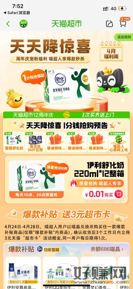 天猫超市8:00 0.01抢一箱奶,很好抢,卡秒,早上我就