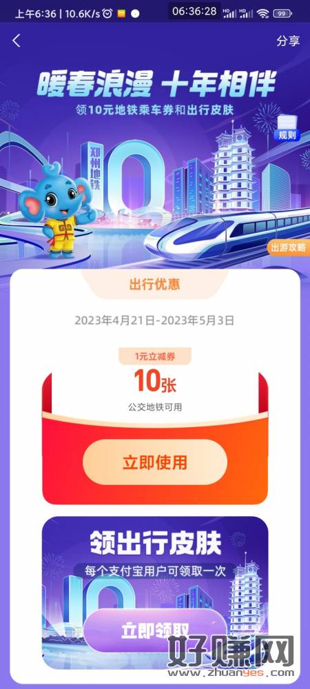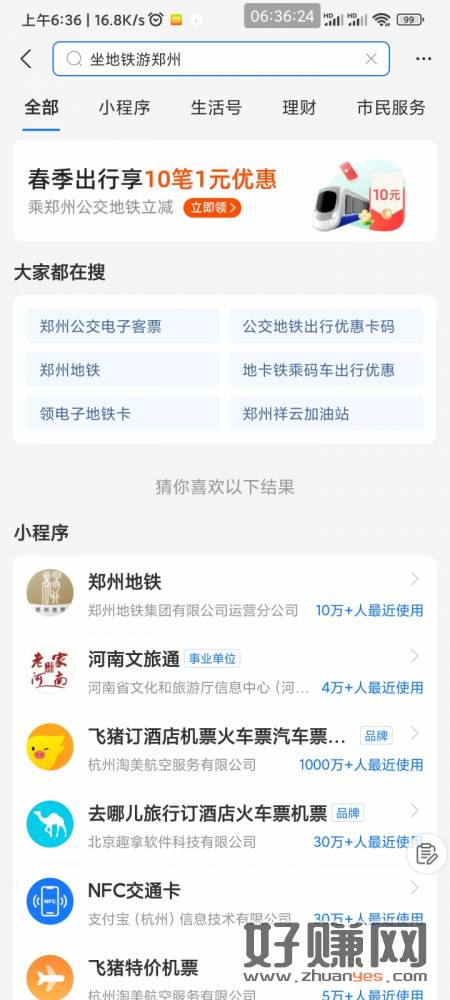 支付宝左上角改成郑州 搜索坐地铁游郑州 领10张1元公交地铁卷全国通用