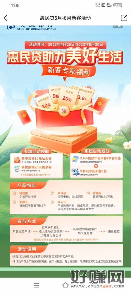 交通银行首页点活动动中心进去找惠民贷新客有礼,申请一下得10