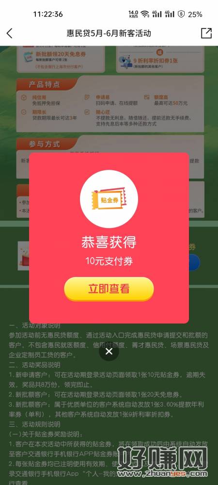 交通银行首页点活动动中心进去找惠民贷新客有礼,申请一下得10