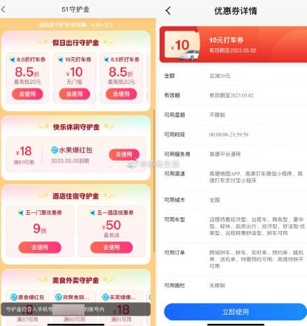 【高德免费领10元无门槛打车券】高德地图APP搜索“五一出行金”->随便点个城市进入->直接领取4张券,其中包含10元无门槛打车券