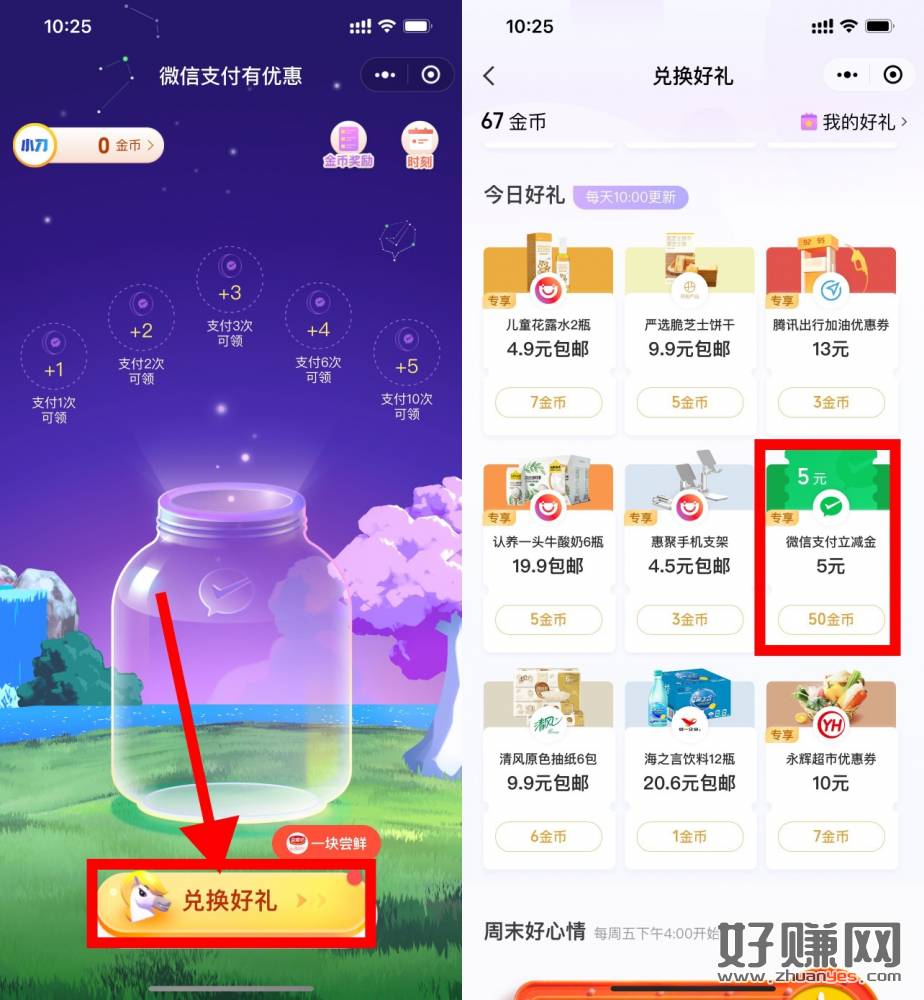 微信打开#小程序:微信支付有优惠 ->兑换好礼->部分人有金币兑换立减金[图片]