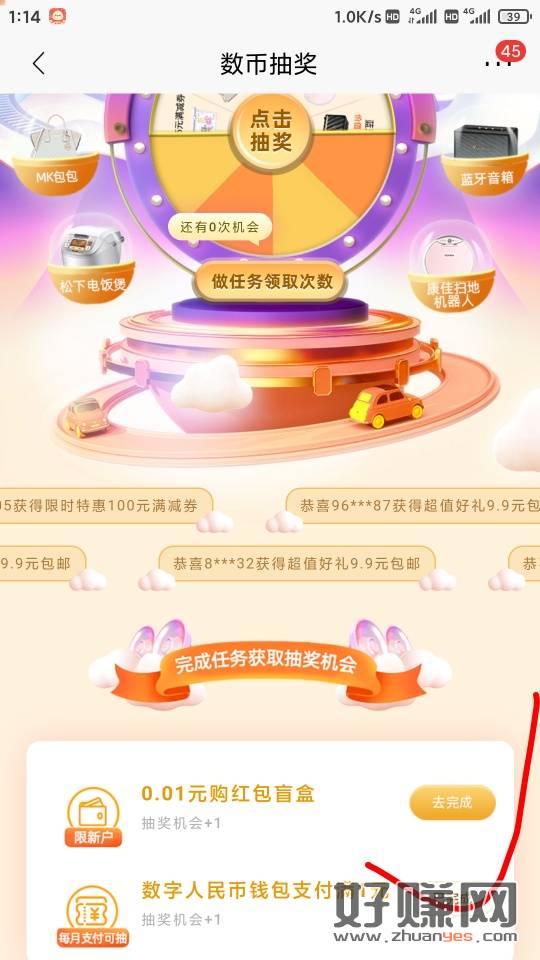 数币三重礼,支付1任务,进去退回不用买,抽奖