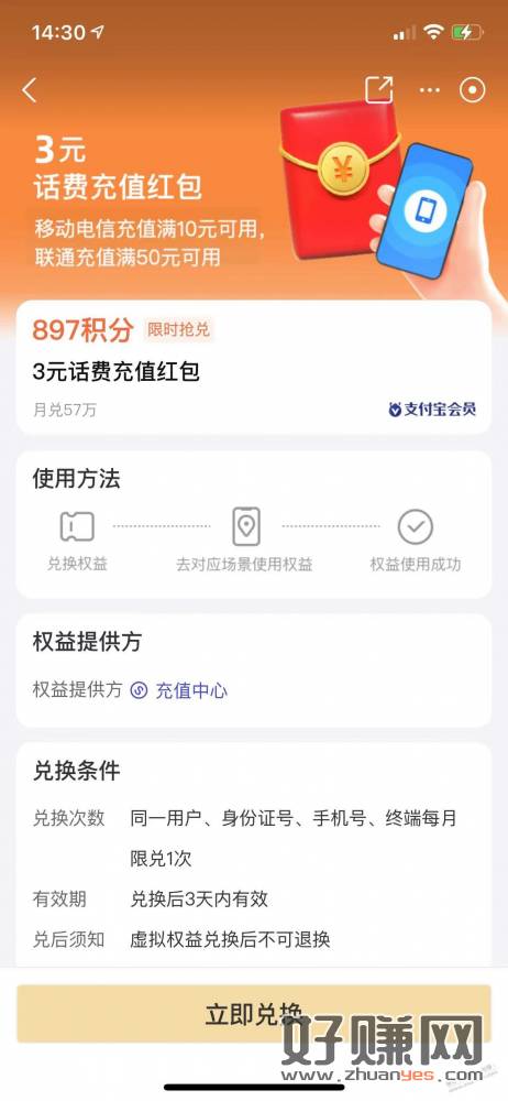 支付宝897积分兑换3元话费券,移动电信满10元可用