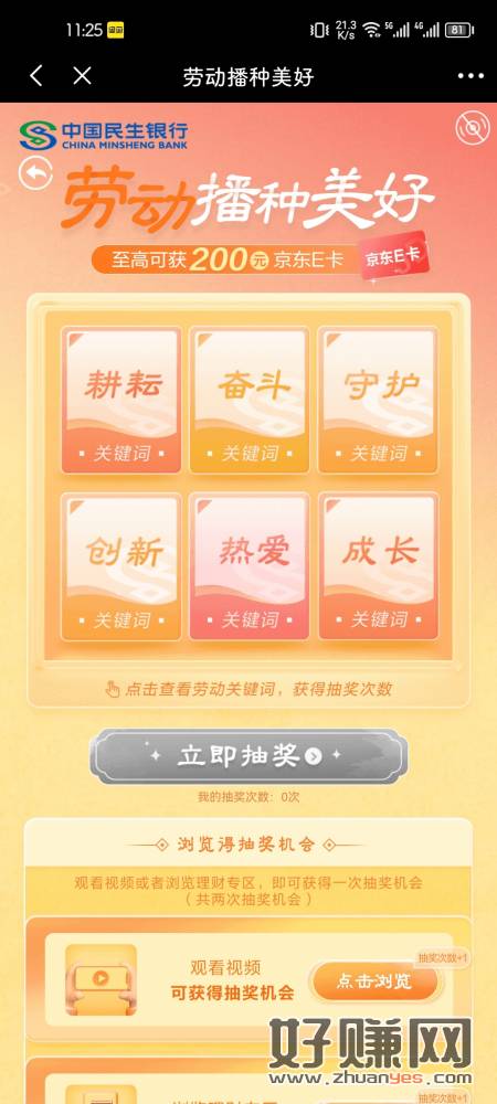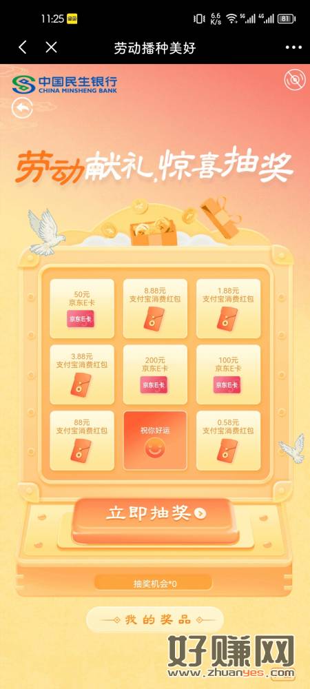 民生银行首页横幅劳动节抽奖。