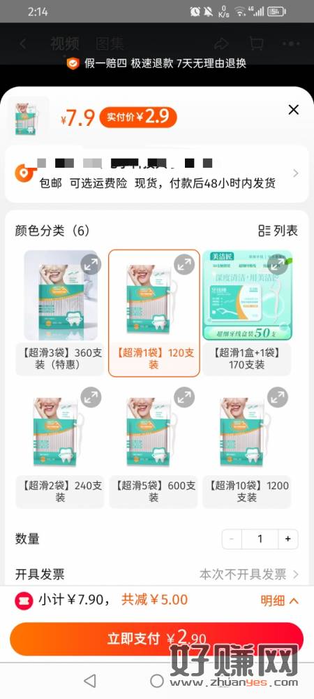 2.9元120只牙线棒包邮好价