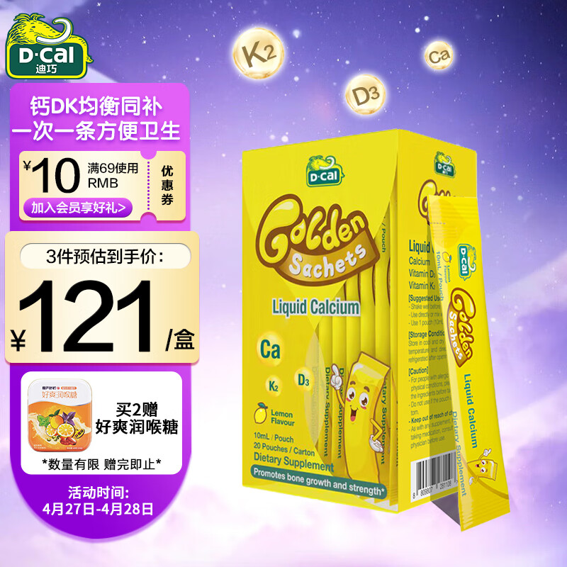 先领499-78券,迪巧 婴幼儿童钙维生素D3K2 10ml*20条/盒