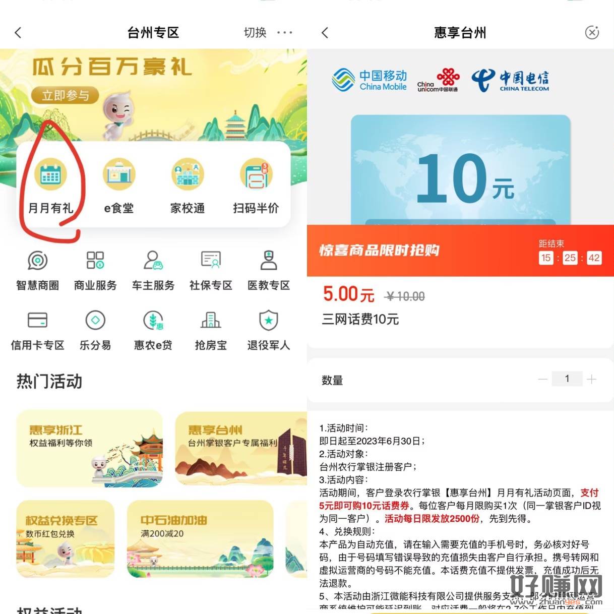 台州城市专区-月月有礼 5充10话费 不用飞 显示没资格的,飞浙江填一下代码199106。