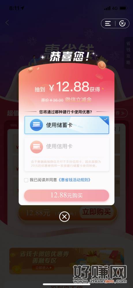 0.99元起购买16元立减金+20元善融券(本人这个月抽中7.99买16元微信立减金),如果抽到14.99元就不要付了,7.99元或者9.99可以考虑参加
