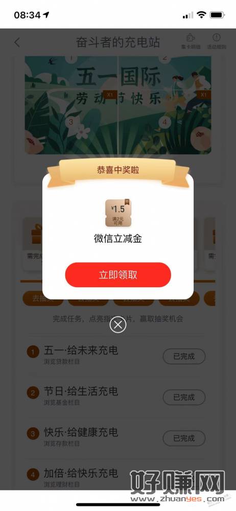 工行APP,任务中心,享活动,奋斗者的充电站(5中3)