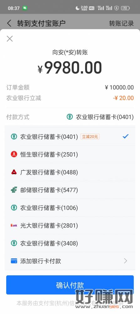 大毛,支付宝转账10000减20,农行株洲,不知道几次,第二次还有,不过限额了