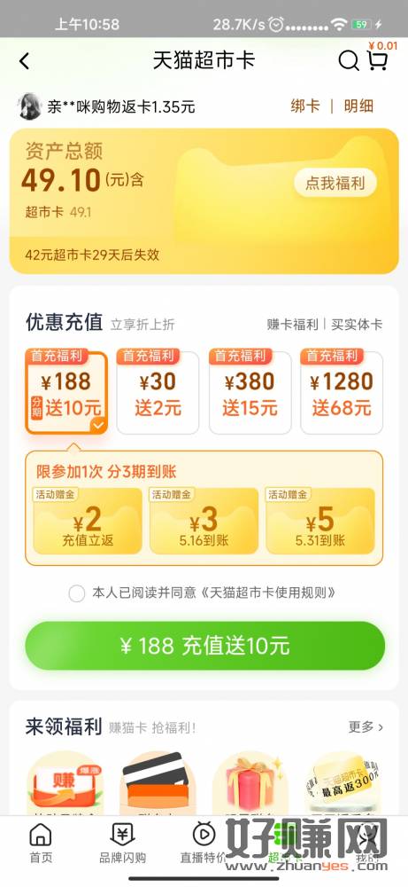 天猫超市之前0.5买过25品牌金的猫超卡已经过期了,可以找客服补了,昨天给我补多了