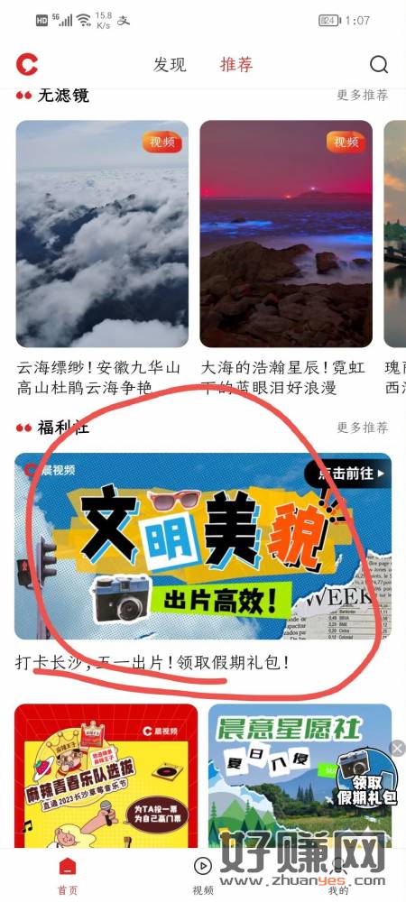 晨视频App首页下滑,福利社可以抽奖,机会费完刚中1+