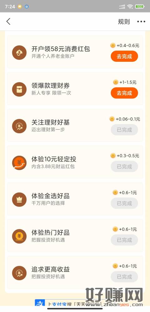 支付宝首页看看有没有这个任务,一个支付宝10元,买那些基金然