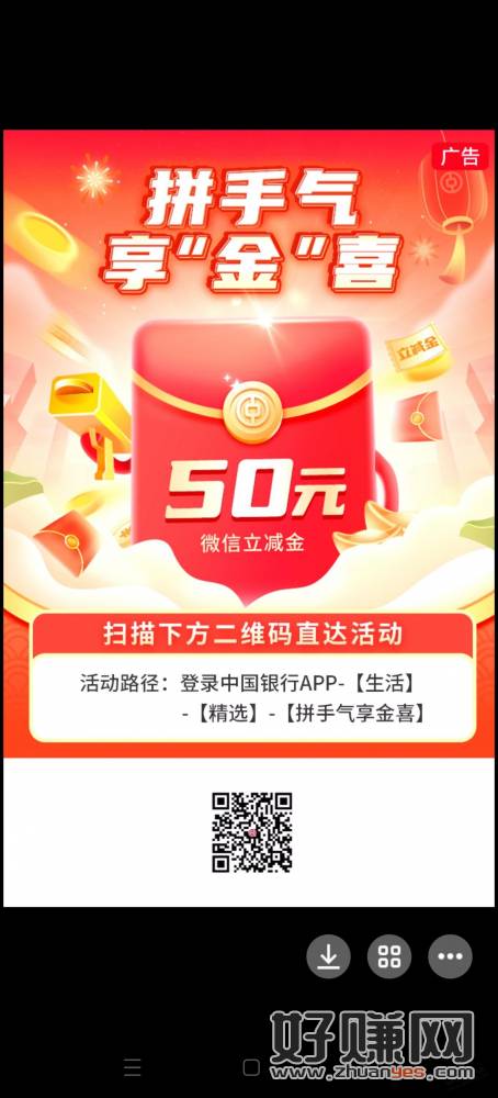 河北中行活动。每人可参团和邀请参团各一次,(共两次)。10人成团后大家一起瓜分50元立减金。邀请人瓜分多些,介意勿扫。