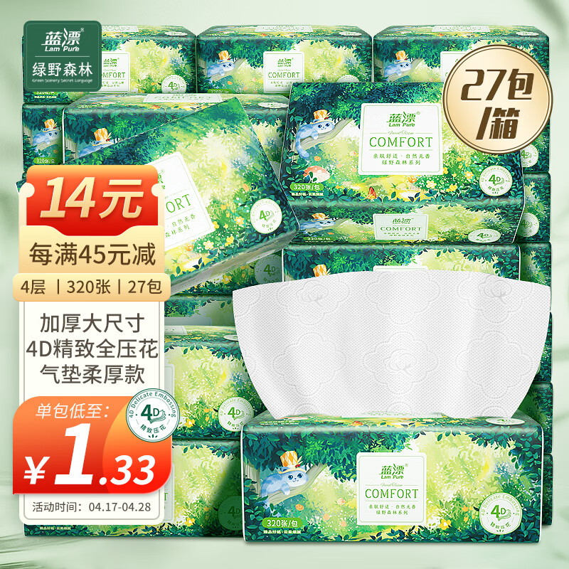 领199-20券,蓝漂 绿野森林系列抽纸320张*27包加厚(4层)