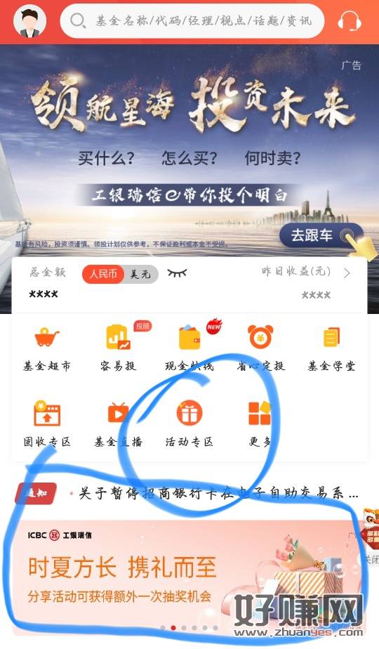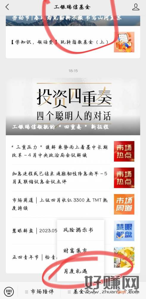 工银瑞信基金app,月度礼遇图片蓝色圈的都是入口都可以直达活
