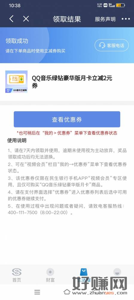 民生银行这月首次点视频会员,运气好会弹出获得视频周卡可卖,我运气不行只得QQ音乐立减券,没啥用