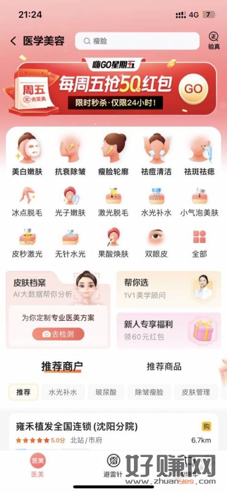 路径 美团 医学美容 横幅50无门槛 中间有一个粉色的新人60无门槛
