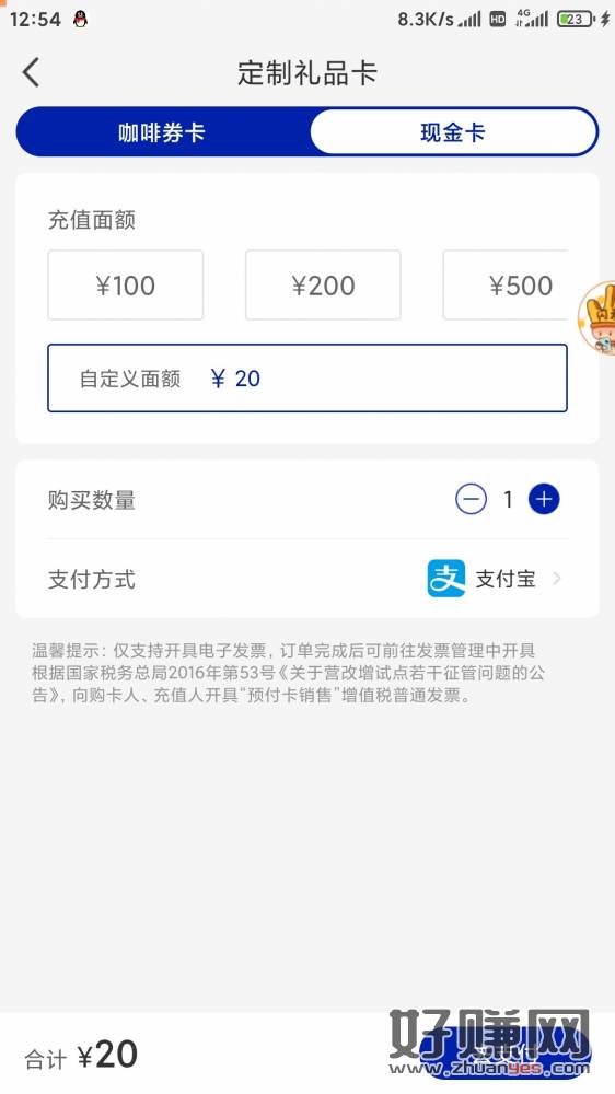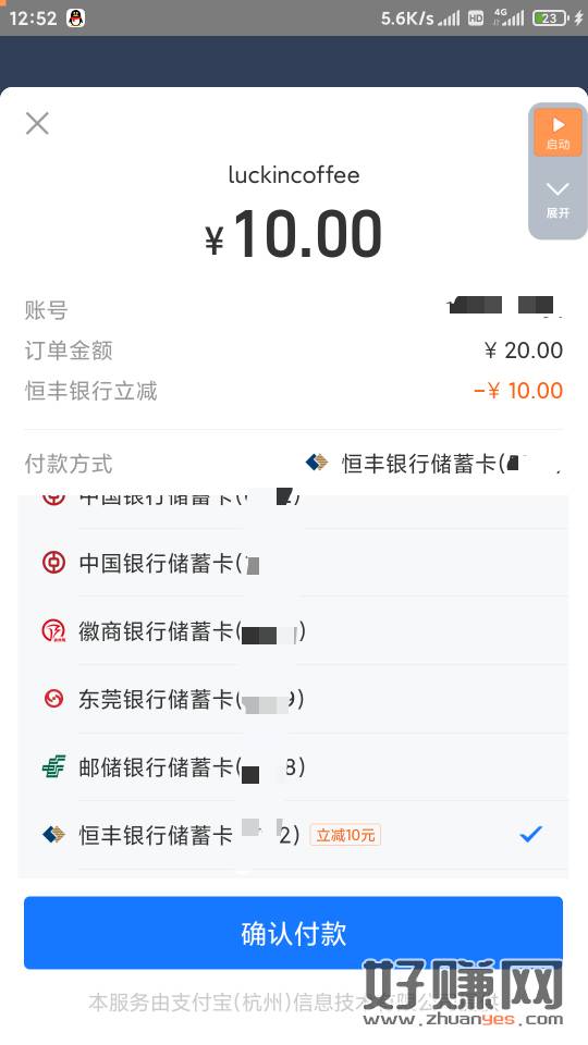 瑞幸app买20极品卡,zfb用恒丰卡付减10