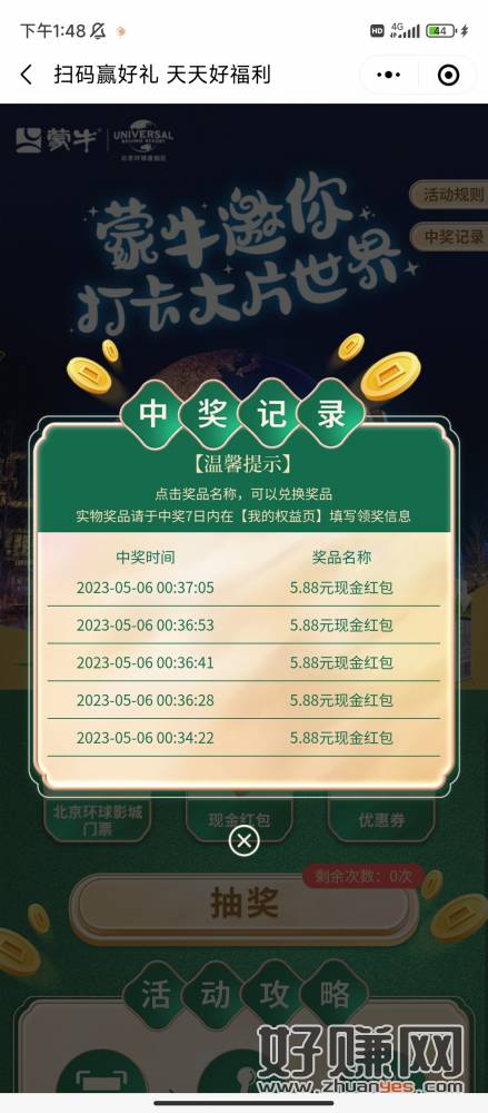 蒙牛纯牛奶。目前定位。广东/浙江/贵州/江西必中5.88。一个微信能玩5次