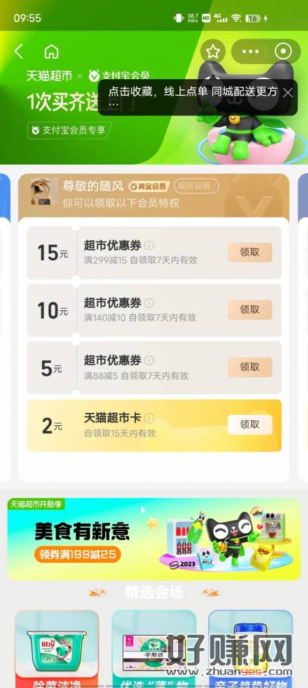 支付宝黄金会员领2猫超