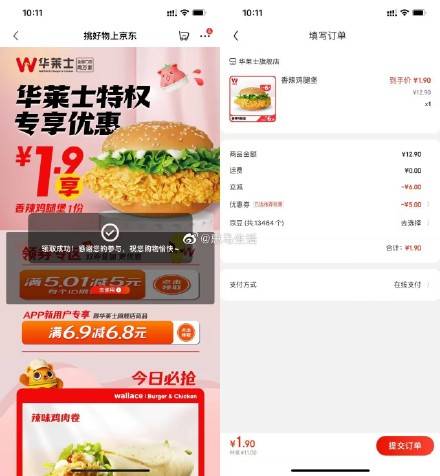 【1.9元吃华莱士鸡肉卷或汉堡】京东领取5元券->鸡肉卷、汉堡 二选一购买,到店核销自取即可