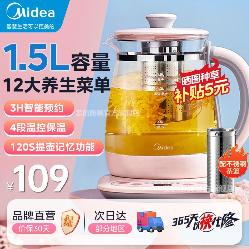 PLUS先领-5全品,美的(Midea)多档调节养生壶1.5L茶漏款