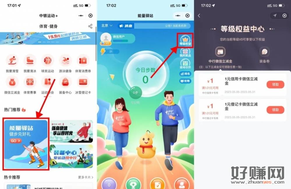 新一期!微信进入小程序“中银运动+”->能量驿站健步兑好礼->右上角“等级权益”->直接领取1元微信立减金,必中必中!拿到了给个反馈谢谢