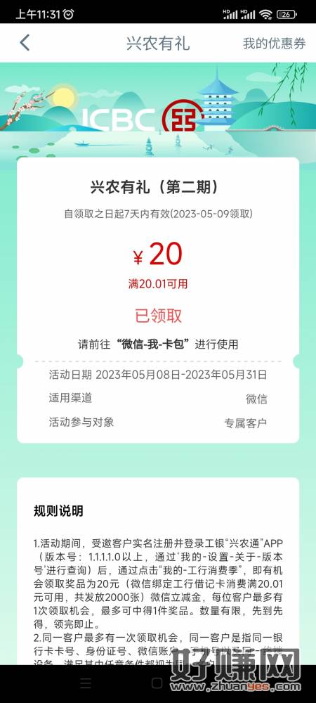 兴农通-工行消费季,领20大毛,上次领过一期的快去,没领过的