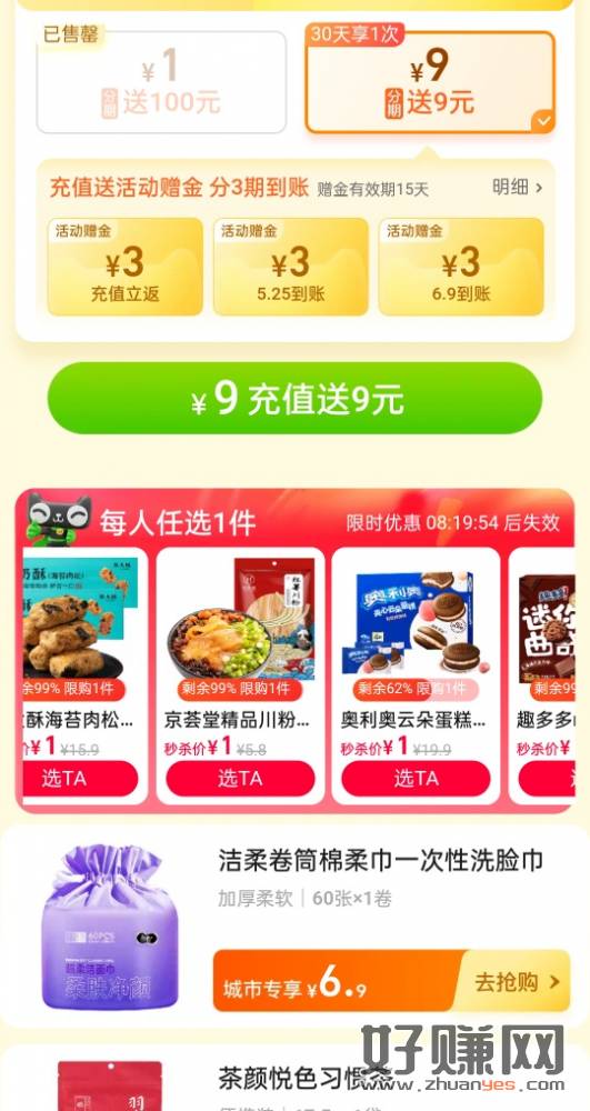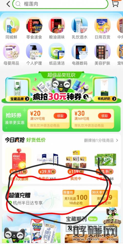 猫超右上角定位地址改杭州(东莞)半日达充9送9进去就看得见一元购商品